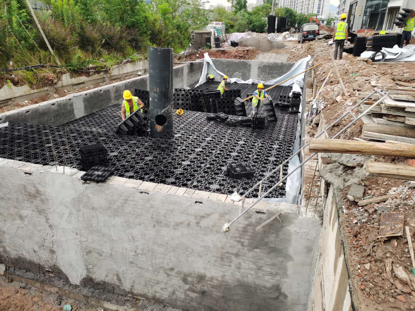 該項目雨水回收系統采用地埋PP模塊組合水池的方式收集雨水,前期經過截污掛籃、棄流過濾,后期通過地埋一體機過濾,消毒,最終使水質達到規范標準,用于廠區綠地的澆灑,景觀補水,道路沖洗。